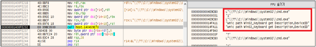 WMI (Windows Management Instrumentation) 명령을 활용하여 시스템 프로파일링을 수행한다. 이를 통해 디스크 드라이브 사양, 입력 장치 정보, 디스플레이 구성 등 하드웨어 및 운영 환경에 대한 정보를 수집하여 감염 시스템의 지문(Fingerprint)을 구성하게 된다. 이러한 정찰 과정은 공격자가 대상 환경에 맞춰 최적화된 악성 행위를 수행할 수 있도록 지원하며, 시스템 환경에 기반한 계정 탈취 및 악용 시나리오를 적용할 수 있게 한다.