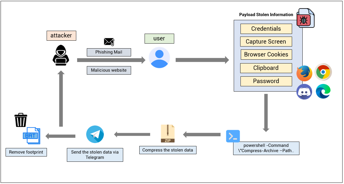 Shuyal Stealer는 주로 피싱 이메일, 악성 웹사이트 등을 통해 유포되며, 사용자가 첨부 파일 실행 또는 악성 링크에 접속하도록 유도하는 사회공학 기법을 기반으로 시스템에 침투한다. 감염 이후에는 WMIC과 PowerShell 스크립트를 활용하여 시스템 정보를 수집하며, 탈취한 데이터를 ZIP 아카이브 형태로 압축한 뒤 Telegram 봇을 통해 유출한다. 탐지 회피를 위해 압축된 아카이브와 탈취한 파일 기록, 악성 실행 파일 등 흔적을 삭제하여 증거 기반 포렌식 분석을 어렵게 만든다.