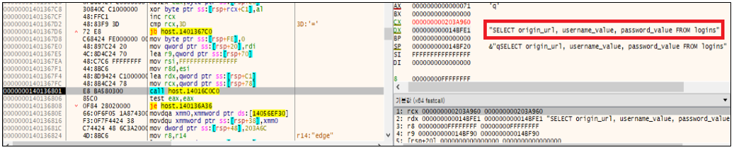 Shuyal Stealer의 탈취 기능 중 하나는 SQLite 데이터베이스를 직접 탐색 및 분석하여 계정 정보를 추출하는 기능이다. 브라우저에서 사용하는 로그인 데이터베이스(DB)를 발견할 경우, SQL 쿼리문을 실행하여 저장된 계정 정보를 탈취한다.