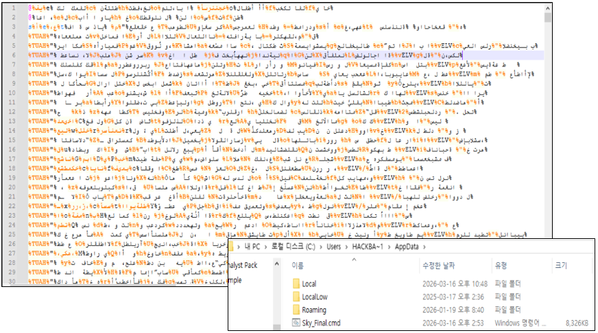 PowerShell 명령을 통해 다운로드된 BAT 파일(Sky_Final.cmd)은 %AppData% 경로에 다운로드 되며, 분석을 방해하기 위해 아랍어 텍스트를 노이즈로 활용한 난독화가 적용되어 있다. %TUAH%, %vELV%, %cAUI%, %wlea%와 같은 변수들이 실제 문자열을 감싸는 형태로 사용되며, 그 사이에 삽입된 아랍어 및 랜덤 문자열은 의미 없는 쓰레기값으로 구성되어 분석을 어렵게 만든다.