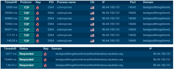 이후 실제 행위를 확인하기 위해 모니터링 도구로 네트워크 활동을 추적한 결과, colorcpl.exe 프로세스에서 외부 통신이 발생하는 것이 관찰된다. colorcpl.exe는 단순 디스플레이 색상 설정과 관련된 정상 프로세스로, 자체적으로 C2와 네트워크 통신을 수행할 이유가 없다.