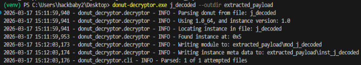 | pip install donut-decryptor donut-decryptor.exe j_decoded --outdir extracted_payload |