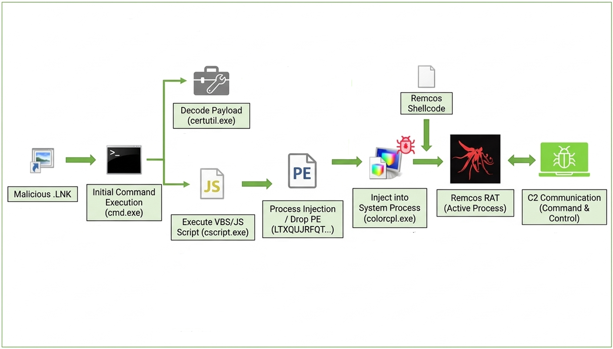 JavaScript는 AutoIt 로더, 스크립트, 암호화된 쉘코드를 드롭한 뒤, 정상 프로세스인 colorcpl.exe에 쉘코드를 인젝션한다. 각 단계는 난독화 및 은닉 기법이 적용되어 있으며, 최종적으로는 메모리 상에서 실행되는 형태의 Remocos RAT 원격 제어 악성코드로 이어진다.