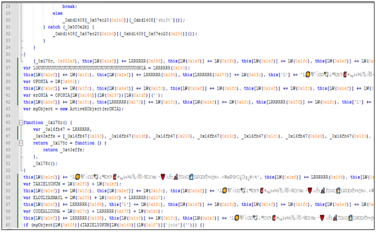 악성 자바스크립트 코드는 심하게 난독화되어 있으며, 불필요한 더미 코드(dummy)와 반복되는 변수명으로 실제 로직을 숨기고 있다. 중간에 유니코드 문자열, 이모지, 특수문자 같은 쓰레기 문자열을 삽입해 시각적으로 분석을 방해하며, 단순히 파일을 열어보는 것만으로는 악성 행위를 바로 확인하기 어렵다.