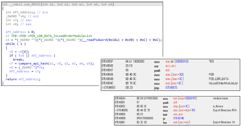 이후 각 모듈의 베이스 주소를 기준으로 e_lfanew를 통해 PE 헤더로 이동하고, Export Directory의 RVA를 확인한 뒤 이를 VA로 변환하여 Export Table을 순회함으로써 필요한 API 주소를 동적으로 추출한다.