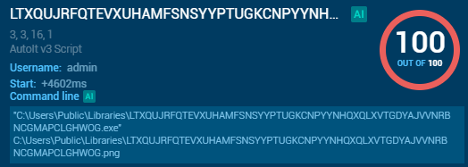 난독화된 JavaScript를 동적 분석을 통해 추적한 결과, 스크립트는 총 3개의 파일을 C:\Users\Public\Libraries 경로에 드롭하는 동작을 수행한다. 이후 드롭된 실행 파일을 호출하면서, 동일한 경로에 생성된 .png 파일을 인자로 전달하여 실행하는 것을 확인할 수 있다. 실제 실행 명령은 다음과 같다.