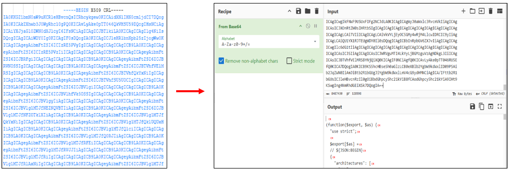 배치 파일 내부에는 -----BEGIN X509 CRL----- 형태의 서명 블록으로 위장된 데이터가 포함되어 있다. 그러나 해당 내용은 실제 인증서나 CRL 정보가 아니라, JavaScript 코드가 Base64로 인코딩된 데이터이다.