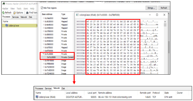 복호화된 쉘코드를 CreateProcessA로 생성한 colorcpl.exe 프로세스를 대상으로 NtAllocateVirtualMemory, NtWriteVirtualMemory, NtCreateThreadEx를 순차적으로 호출하여 코드 인젝션을 수행한다.
