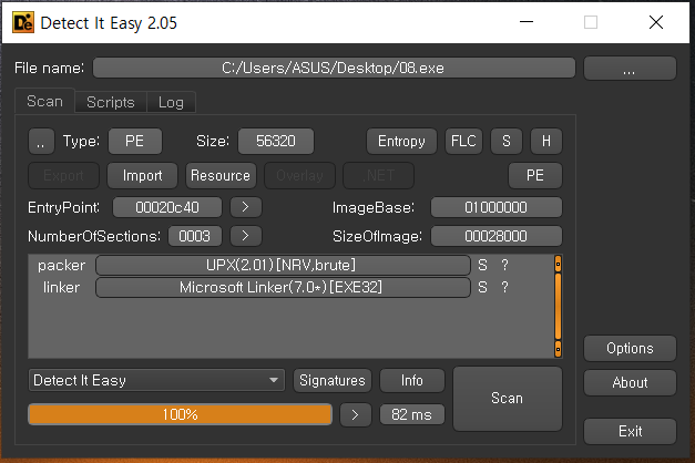 UPX(2.01) 버전으로 패킹 되어 있습니다.