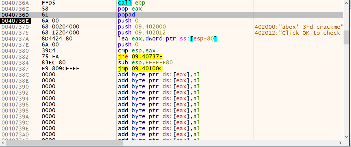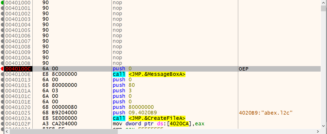 OEP 주소로 이동했습니다. 근데 위로 스크롤 올려보니 12바이트 만큼 NOP 명령어로 되어있고