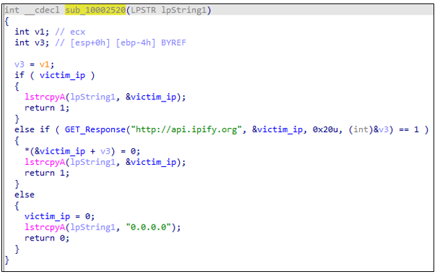 피해자의 공인 IP 주소를 확인하기 위해 hxxp://api[.]ipify[.]org HTTP GET 요청을 수행한다. 만약 악성코드가 해당 웹사이트에 접속할 수 없는 경우에는, 대체 값으로 0.0.0.0을 사용한다.