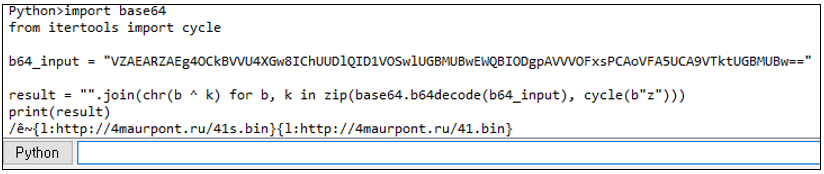 C2 응답이 유효하다고 판단하면, 이후 Base64 디코딩 및 XOR(z) 연산 과정을 진행한다. 해당 응답을 Base64로 디코딩한 뒤, 결과 바이트를 문자 'z'(0x7A)와 XOR하여 최종 페이로드 명령을 추출한다. 이 과정을 Python 코드로 작성하면 다음과 같다.