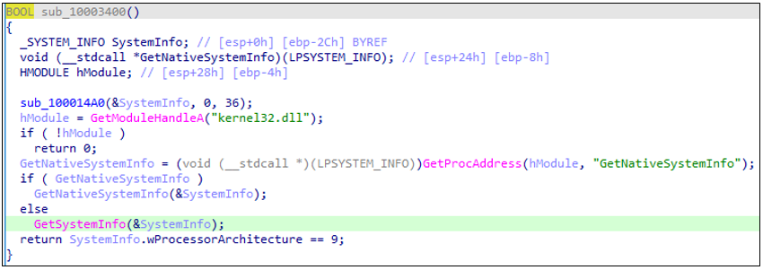 GetProcAddress로 GetNativeSystemInfo 함수 주소를 가져와 _SYSTEM_INFO를 가져온다. 프로세서 아키텍처가 AMD64값이 9인지 확인한다. 현재 시스템이 64비트인지 확인하는 루틴으로 보인다.