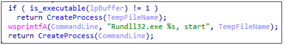 EXE 파일인 경우 임시 파일의 경로를 명령줄 인자(Command Line)로 넘겨 CreateProcess()를 호출하여 새로운 프로세스를 생성한다. DLL 파일인 경우 CreateProcessA를 다시 호출하지만 실행 파일로 rundll32.exe를 지정 명령줄 인자로 다음과 같이 전달하여 악성 DLL의 Export 함수를 실행한다.