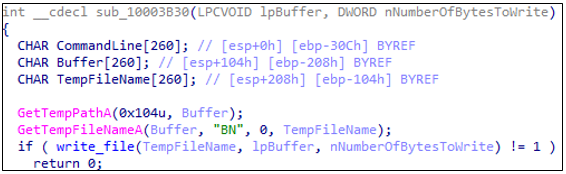 GetTempPathA()를 호출하여 현재 사용자 세션의 Temp 디렉토리 경로를 추출한다. 예) C:\Users\<User>\AppData\Local\Temp\ ,이후 GetTempFileNameA()를 호출하여 해당 경로에 "BN" 접두사를 붙여 고유한 임시 파일 이름을 생성한다. 이후 해당 파일에 다운로드한 페이로드 데이터를 복사한다.