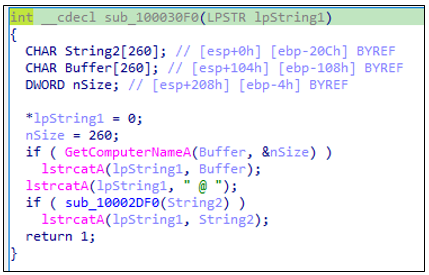 GUID를 생성한 이후, GetComputerNameA()를 호출하여 컴퓨터의 호스트 이름(Hostname)을 가져오고, 문자열 끝에 "@" 구분자를 붙인다.