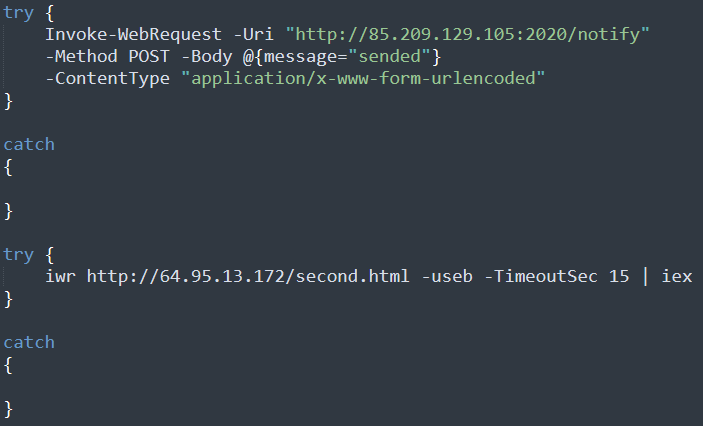 첫 번째 블록 Invoke-WebRequest 블록은 POST 요청으로 hxxp://85.209.129.105:2020/notify에 message=sended를