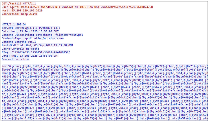 hxxp://85.209.129.105:2020/test112 요청 시 난독화된 파워쉘 스크립트 내용이 script.ps1 파일명으로 저장된다.