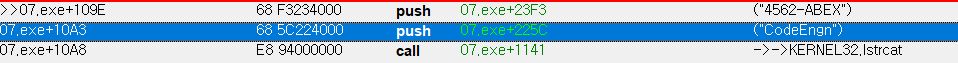 후에 4562-ABEX와 CodeEngn 문자열이 KERNEL32.lstrcat 함수를 통과함으로써