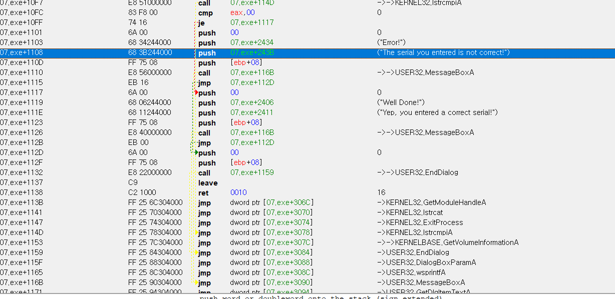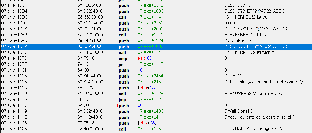 그럼 해당 프로그램의 시리얼은 07.exe+2000 주소에 담긴 문자열이 시리얼이 되겠네요.