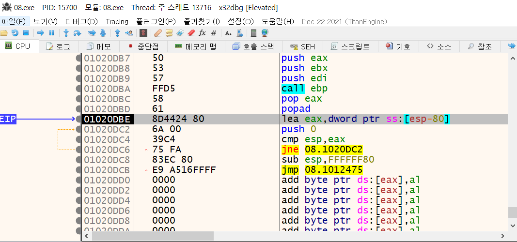 중단점이 적중됬습니다. 후에 JMP로 어딘가로 주소로 이동하는 코드가 보입니다.