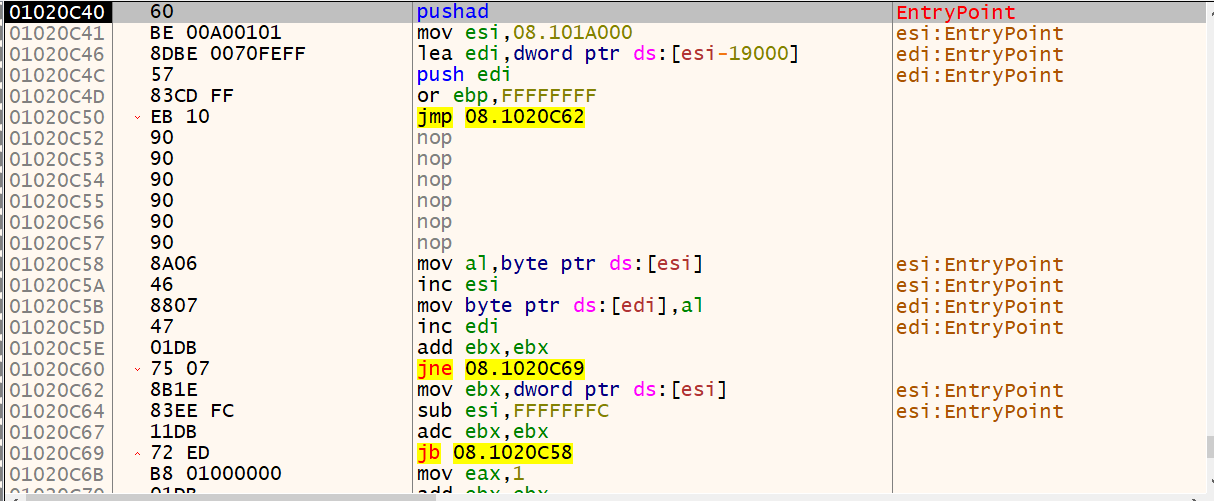 실행 압축을 풀기위해서 pushad 명령어로 내 레지스터 데이터들을 모두 스택에 넣는 것 같습니다.